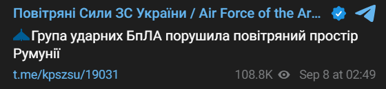 08:50 Повітряні сили ЗСУ заявили, що російські "Шахеди" залетіли на територію Румунії.