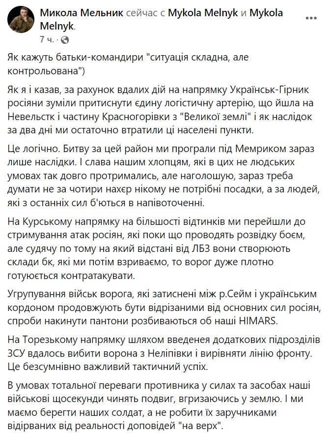 "За рахунок вдалих дій на напрямку Українсько-Гірник росіяни зуміли притиснути єдину логістичну артерію, яка йшла на Невельське та частину Красногорівки з "Великої землі" і як наслідок за два дні ми остаточно втратили ці населені пункти", - написав він на своїй сторінці у Facebook.