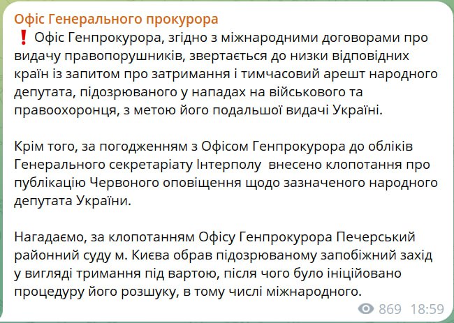 Відомство звернулося до Інтерполу з проханням виписати червону мітку нардепу, ім'я якого не повідомляється, але йдеться про Дмитрука, якого підозрюють "у нападах на військового та правоохоронця".