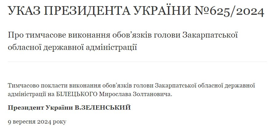 "Тимчасово покласти виконання обов'язків голови Закарпатської обласної державної адміністрації на Білецького Мирослава Золтановича", - йдеться у документі.