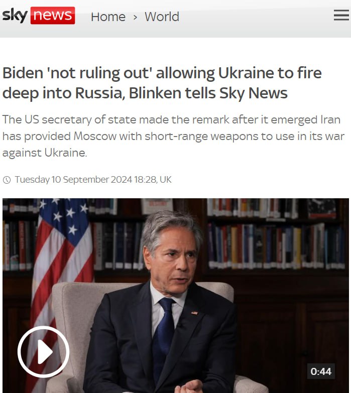 Сьогодні Блінкен анонсував, що 13 вересня Байден проведе зустріч із прем'єр-міністром Великобританії Кіром Стармером, на якій однією з тем стане дозвіл українським силам бити вглиб територією Росії західною зброєю.
