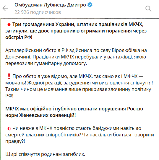 Лубинець засудив Міжнародний комітет Червоного Хреста за те, що той не відреагував на обстріл та загибель своїх співробітників.