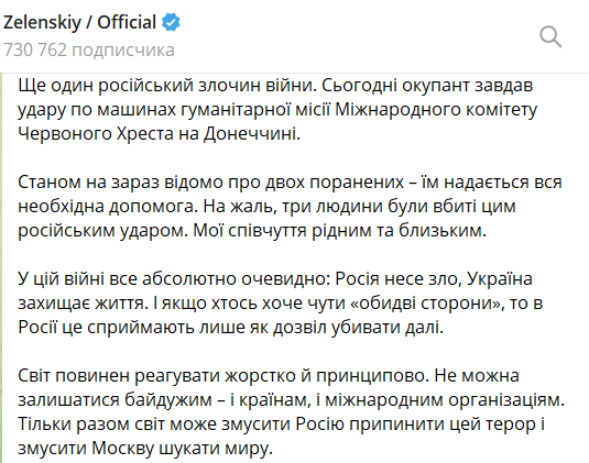 Президент України Володимир Зеленський вже заявив, що співробітники Червоного Хреста загинули внаслідок російського удару.