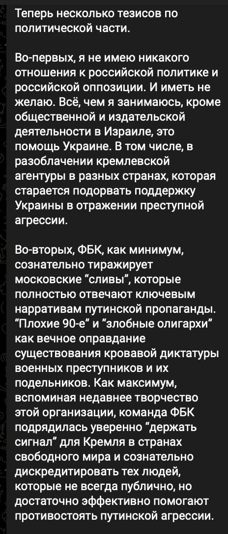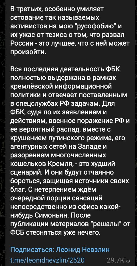 "Всі нібито "докази" моєї причетності до чогось, схоже, були отримані представниками ФБК безпосередньо з Москви. Підтверджує це, наприклад, нещодавня публікація скріншотів цих же нібито "переписок" у кремлівському RT, якій успадковує сьогоднішній твір", - заявив Невзлін..