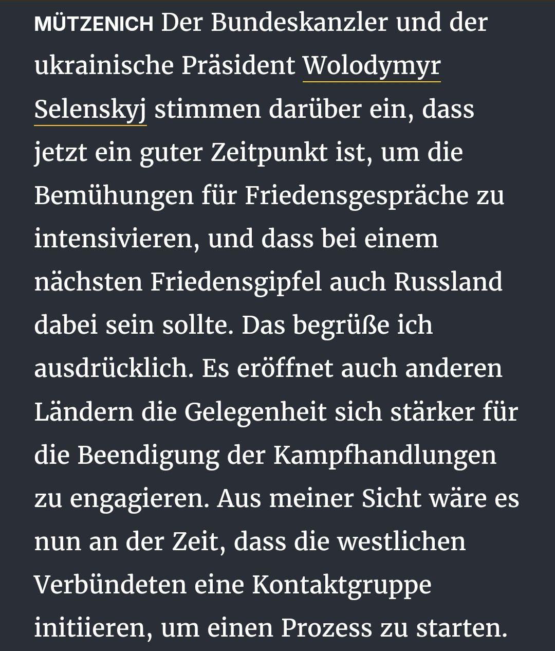 "Федеральний канцлер і президент України Володимир Зеленський згодні з тим, що зараз підходящий момент для активізації зусиль щодо проведення мирних переговорів, і що на наступному мирному саміті Росія також має бути присутньою. Я це однозначно вітаю. Це також дає іншим країнам можливість активніше брати участь у припиненні бойових дій. На мій погляд, настав час для західних союзників ініціювати контактну групу, щоби запустити цей процес", - сказав Мютценіх в інтерв'ю газеті Rheinische Post.