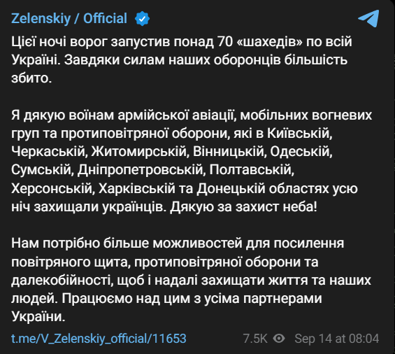 08:10 Вночі Україною було запущено понад 70 "Шахедів", більша частина з них збита. Про це повідомив президент Володимир Зеленський.