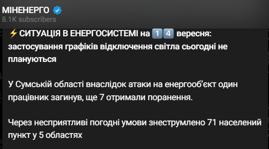 "У Сумській області внаслідок обстрілу території енергооб'єкта було пошкоджено обладнання та укриття, знеструмлено кілька підстанцій. Внаслідок атаки загинув працівник підприємства - 54-річний водій, ще 7 працівників отримали поранення та були госпіталізовані", - йдеться у повідомленні.