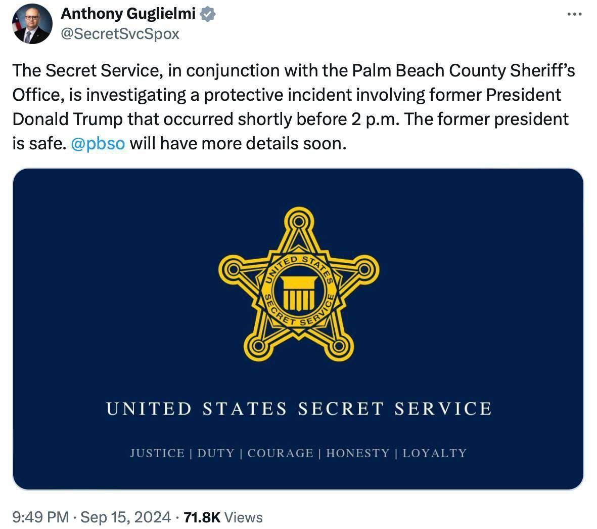 Секретна служба США, яка охороняє Трампа, заявила, що досліджує інцидент, заявив її прес-секретар у соцмережі Х.