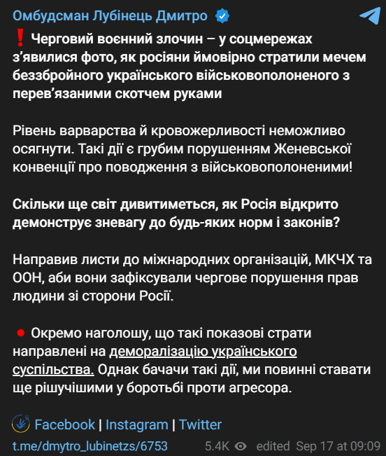 "Черговий військовий злочин - росіяни стратили мечем беззбройного українського військовополоненого з перев'язаними скотчем руками. Рівень варварства та кровожерності неможливо осягнути. Такі дії є грубим порушенням Женевської конвенції про поводження з військовополоненими", - написав Лубинець.