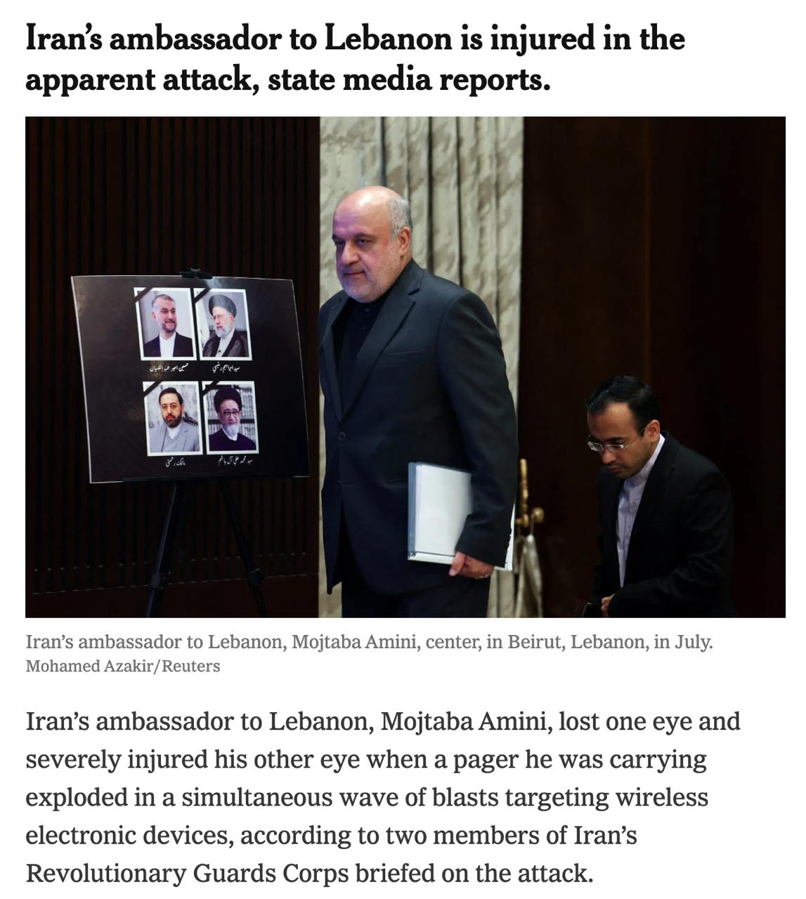 Посол Ірану в Лівані Моджтаба Амані втратив одне око і серйозно пошкодив друге внаслідок вибуху пейджера.