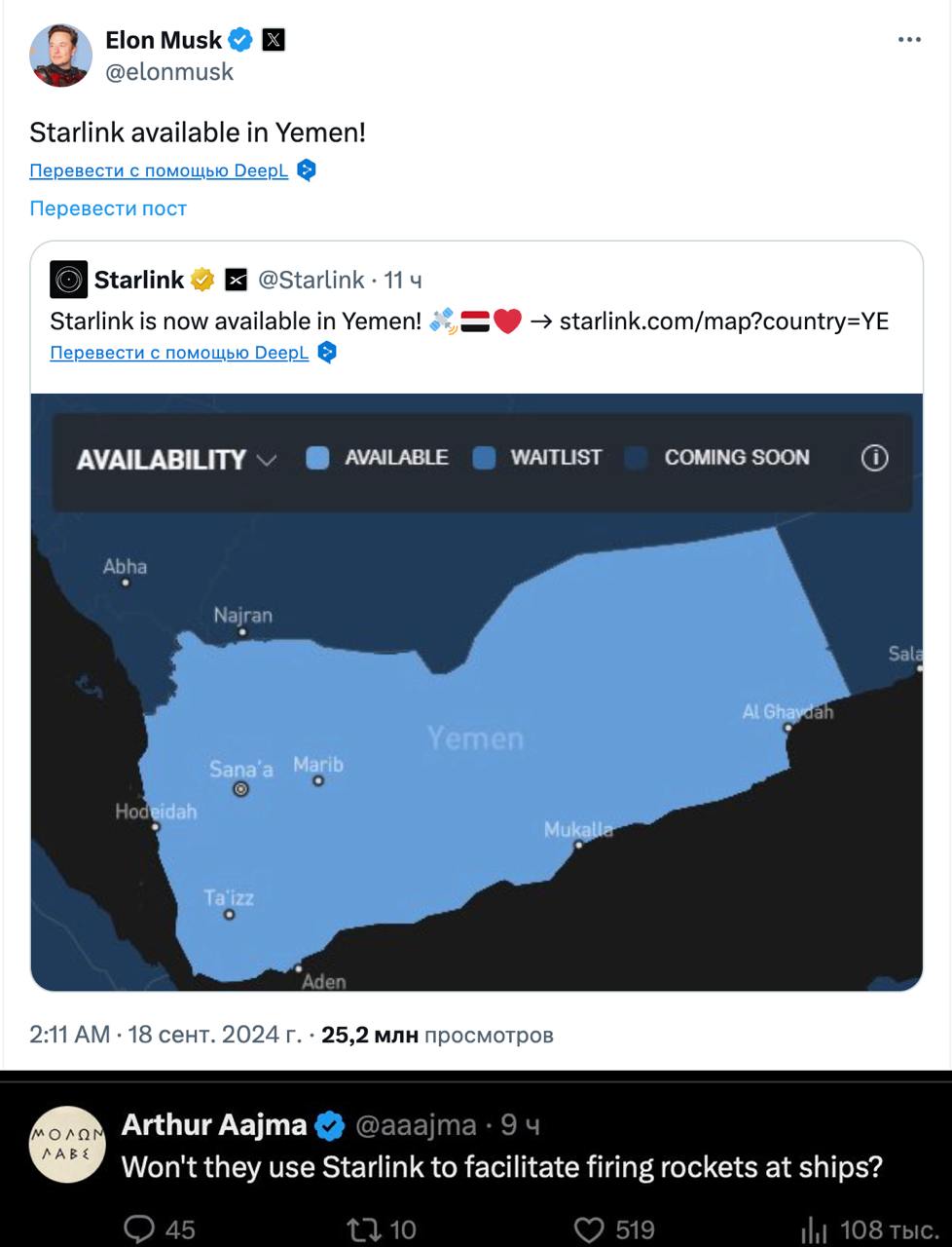 Ілон Маск провів інтернет від Starlink до Ємену, частину якого займають хусіти, що воюють із США.