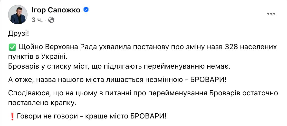 "Сподіваюся, що на цьому у питанні про перейменування Броварів остаточно поставлено крапку", - написав Сапожко у Фейсбуці.