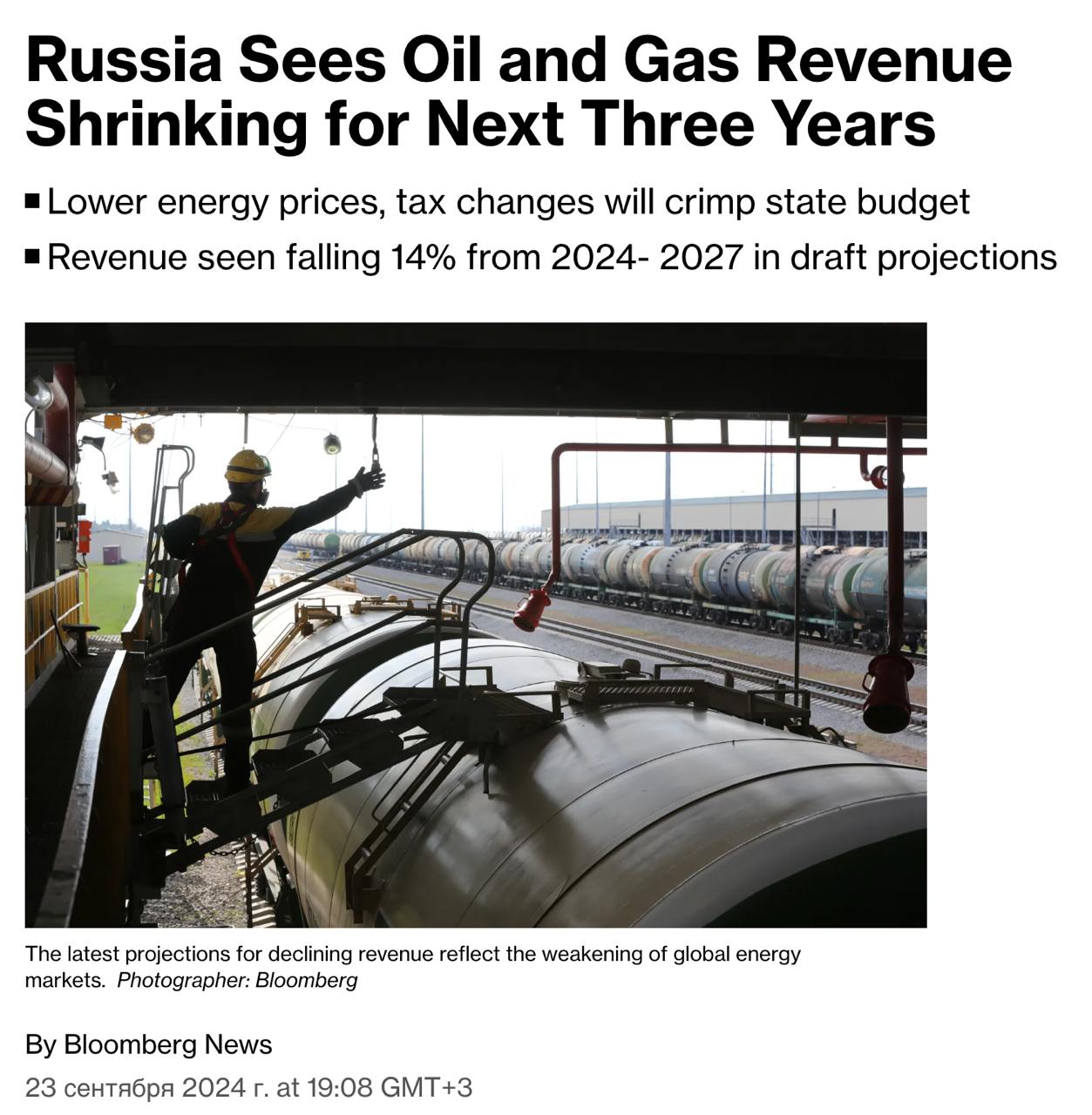 Згідно з проектом трирічного бюджету, з яким ознайомилося агентство, Кремль прогнозує скорочення своєї ключової статті доходу з 11,3 млрд рублів (118 млн доларів) у 2024 році до 9,7 млрд рублів у 2027-му.