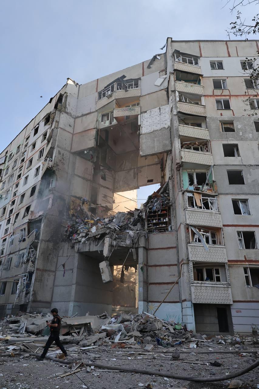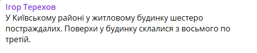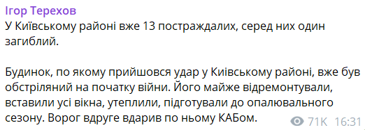 Тим часом з'явилися фото та відео з місця влучення бомби у дев'ятиповерховий житловий будинок у Київському районі. Терехов розповів, що поверхи в будинку склалися з восьмого по третій і уточнив, що будинок, по якому був удар, вже був обстріляний на початку війни. Його майже відремонтували, вставили усі вікна, утеплили та підготували до опалювального сезону. Однак багатоповерхівкою знову вдарили бомбою.