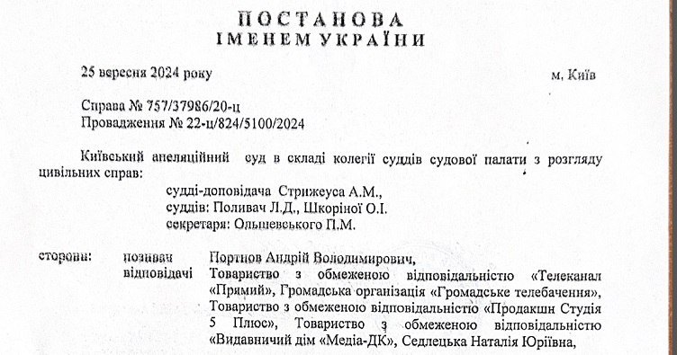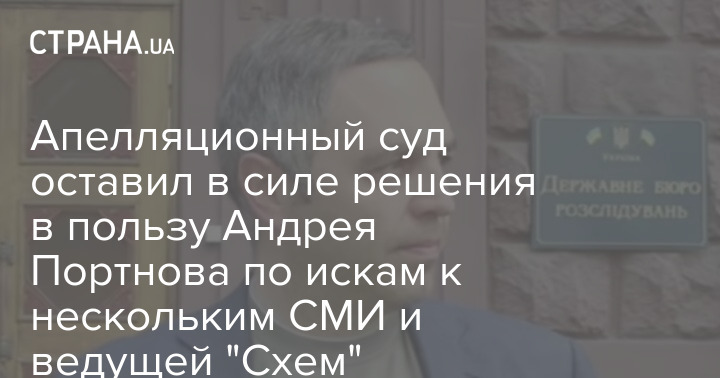 Київський апеляційний суд підтвердив рішення щодо позову юриста Андрія Портнова до кількох ЗМІ та ведучої програми "Схеми" Наталі Седлецької. Він залишив чинним рішення суду першої інстанції на користь позивача.