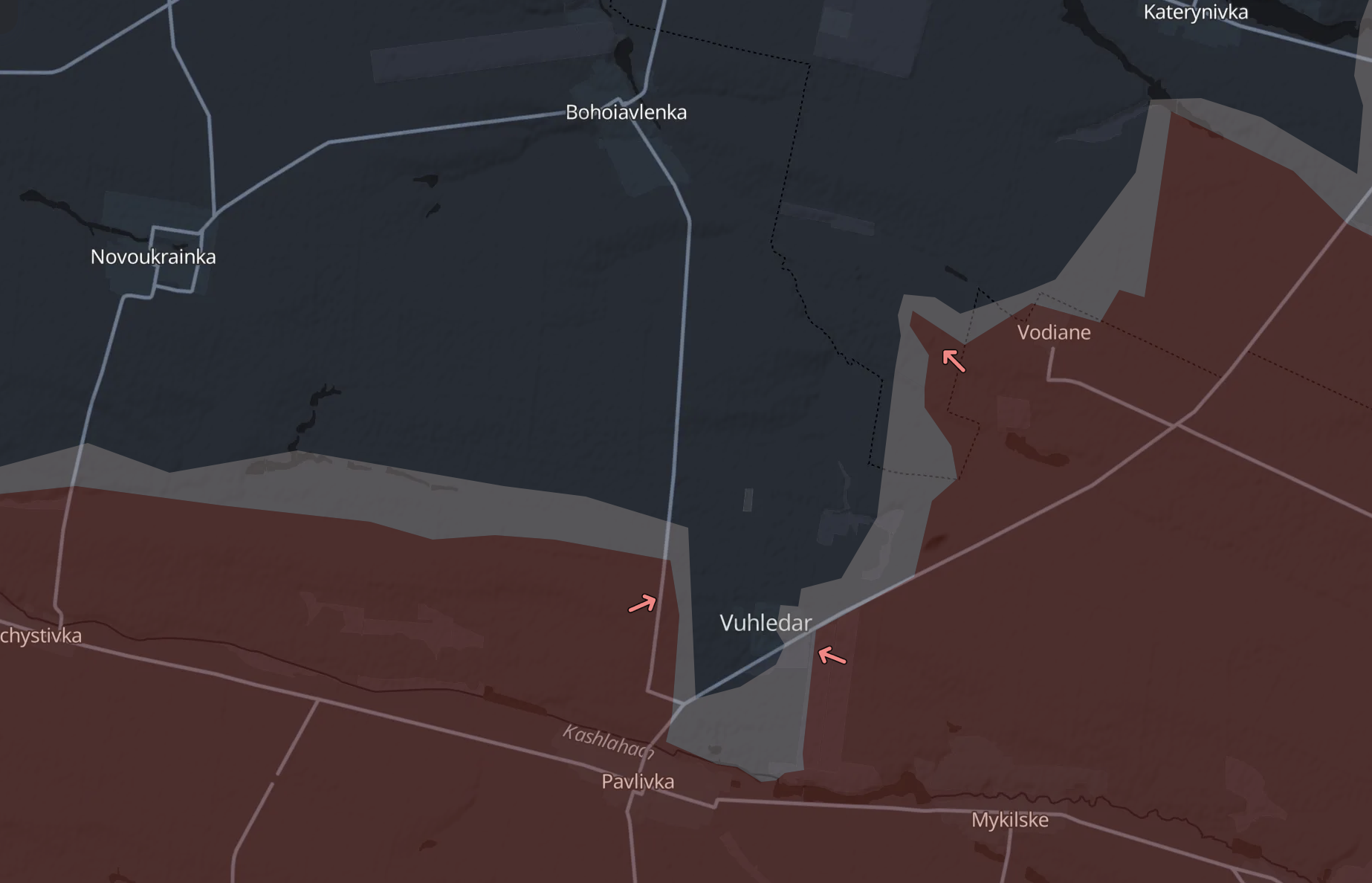 Українські військові повідомляють, що російські війська просунулися з боку Водяного на північ від Вугледару. Як пише боєць "Айдара" Станіслав Бунятов, атаки там продовжуються весь день. Мабуть, росіяни намагаються замкнути оточення довкола міста.