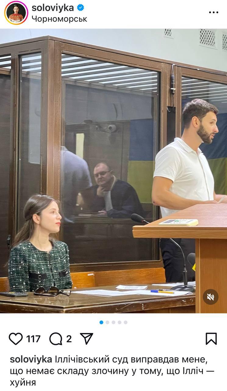 "Іллічівський суд виправдав мене, що немає складу злочину у тому, що Ілліч - ху@ня", - прокоментувала подію Соловій у соцмережі.