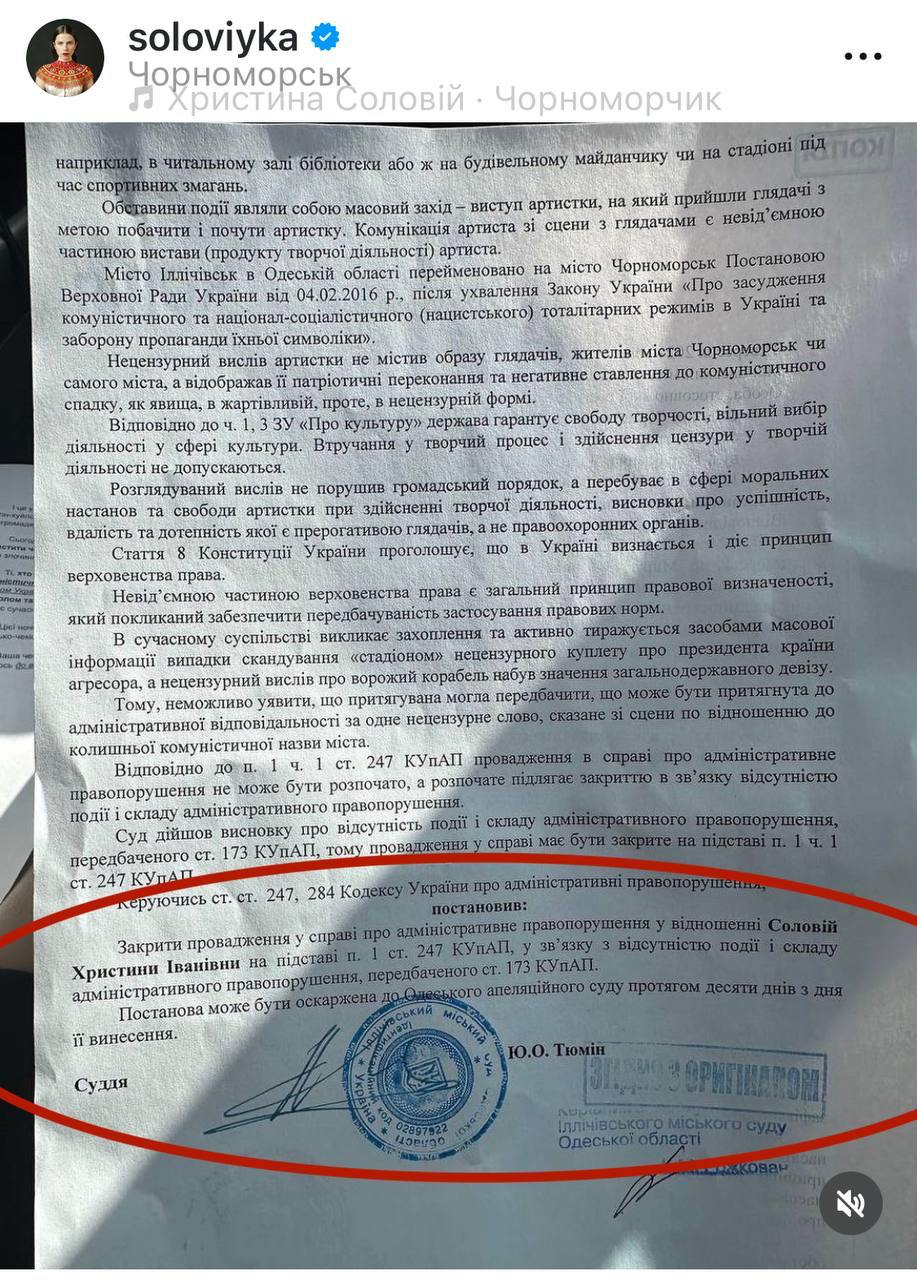 Іллічівський міський суд Одеської області виправдав співачку Христину Соловій, яка на концерті в цьому населеному пункті назвала його стару назву Іллічівськ "повною ху@нею". Артистці інкримінували дрібне хуліганство.