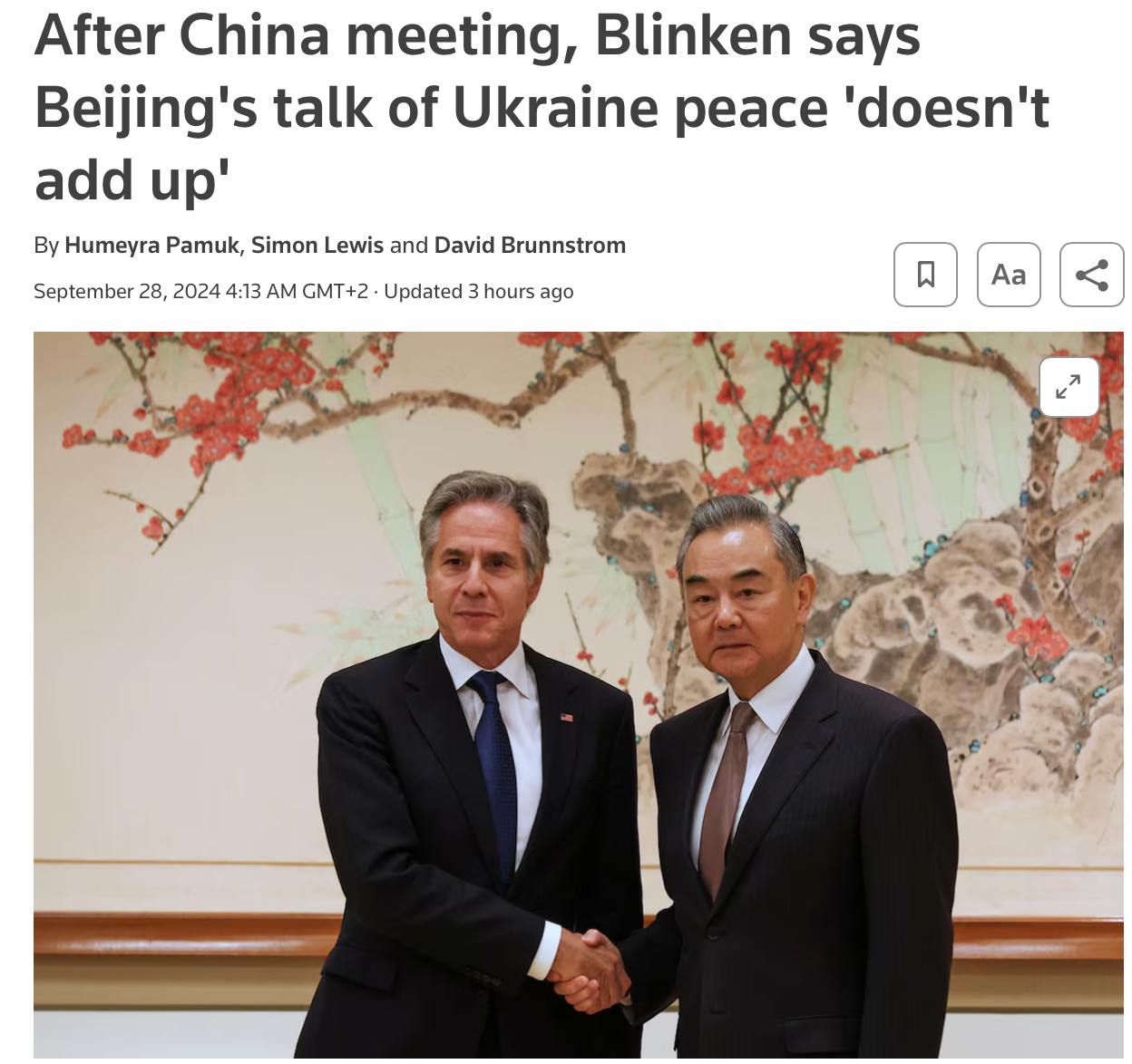 На зустрічі з міністром закордонних справ КНР Ван І він заявив, що розмови Пекіна про мир в Україні "не сходяться" з тим, що Китай підтримує військово-промисловий комплекс Росії.