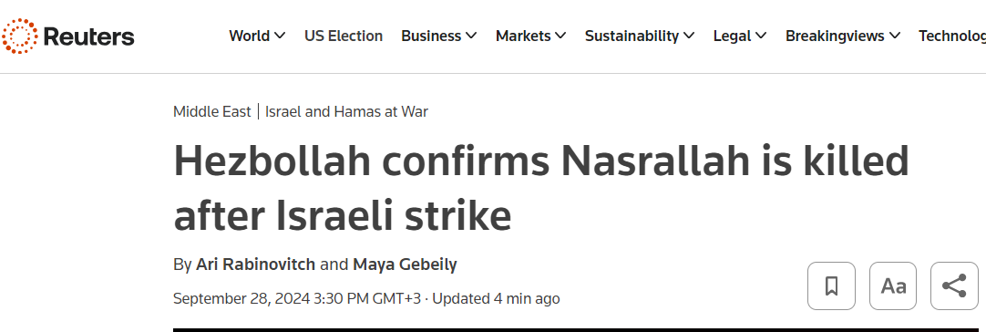 Раніше армія оборони Ізраїлю заявила, що лідера "Хезболли" Хасана Насраллу було вбито під час вчорашнього удару по командному центру угрупування в Бейруті.