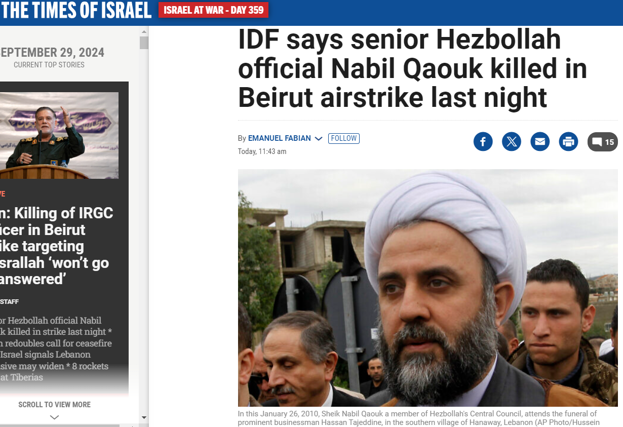 Армія оборони Ізраїлю заявила, що високопоставленого представника "Хезболли" Набіля Каука було вбито в результаті авіаудару по столиці Лівану.