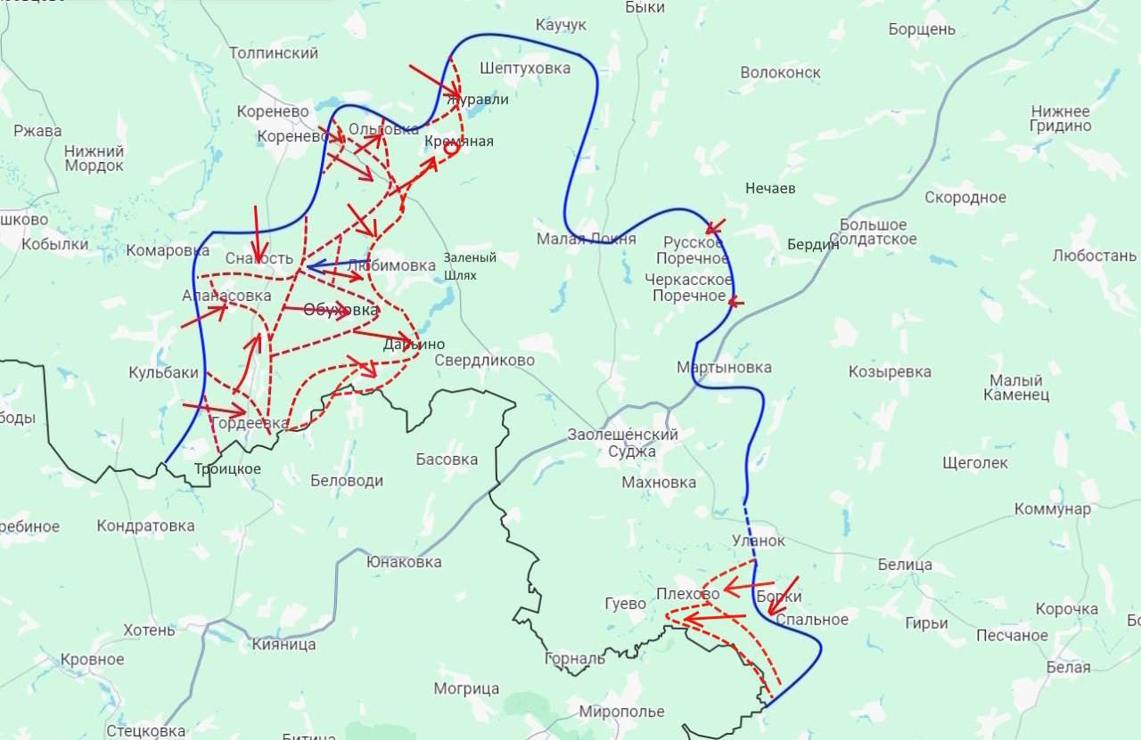 По-перше, атаковані українські позиції на південь від Глушкова з наміром відкинути ЗСУ за межі кордону. Другий напрямок атаки - село Плехове на південь від Суджі, де це село, як заявляється, намагаються оточити, відрізавши його від кордону. Також сьогодні російські паблики повідомили, що ЗСУ витіснена з Ольгівки під Коренево.