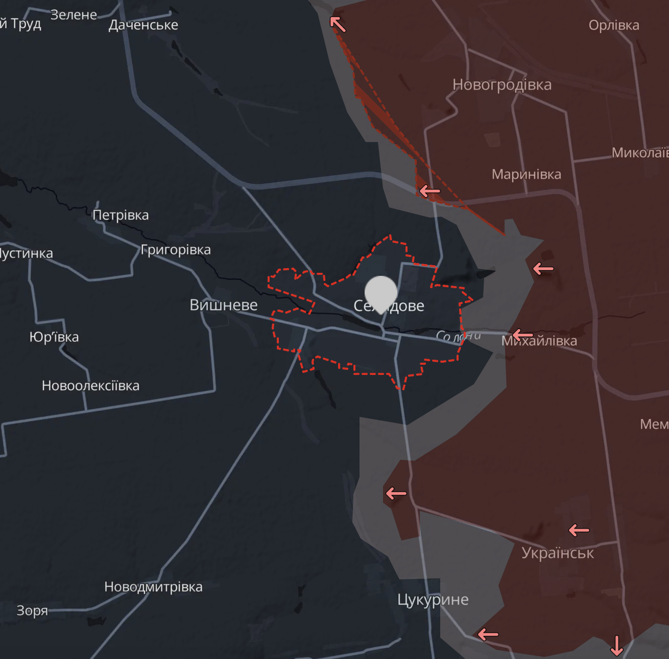Також вчора Deep State повідомив про захоплення росіянами села Маринівка та широку смугу на південний захід від Новогродівки. Весь цей напрямок на Селидове з північного сходу.