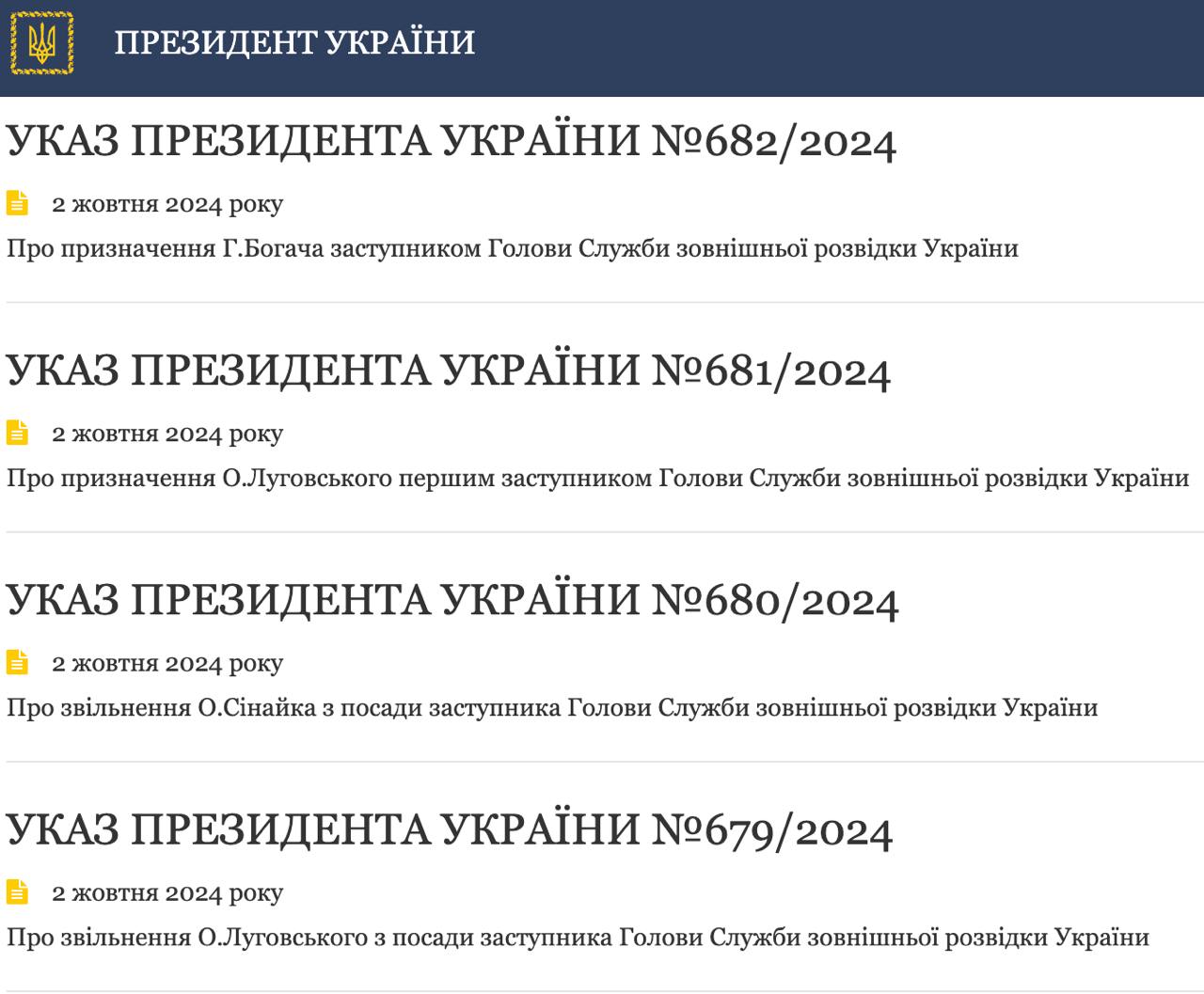 Своїми указами Зеленський звільнив заступника голови СЗР Олега Синайка, а натомість призначив Геннадія Богача. Також Олега Луговського з посади заступника підвищив до першого заступника.