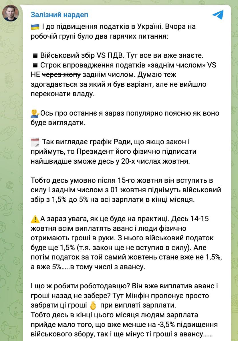 "І що робити роботодавцю? Він уже виплатив аванс і гроші назад не забере? Тут Мінфін пропонує просто забрати ці гроші при виплаті заробітної плати. Тобто десь наприкінці цього місяця людям зарплата прийде мало того, що вже менше на -3, 5% підвищення військового збору, та й ще мінус ті гроші щодо авансу", - написав Желєзняк.