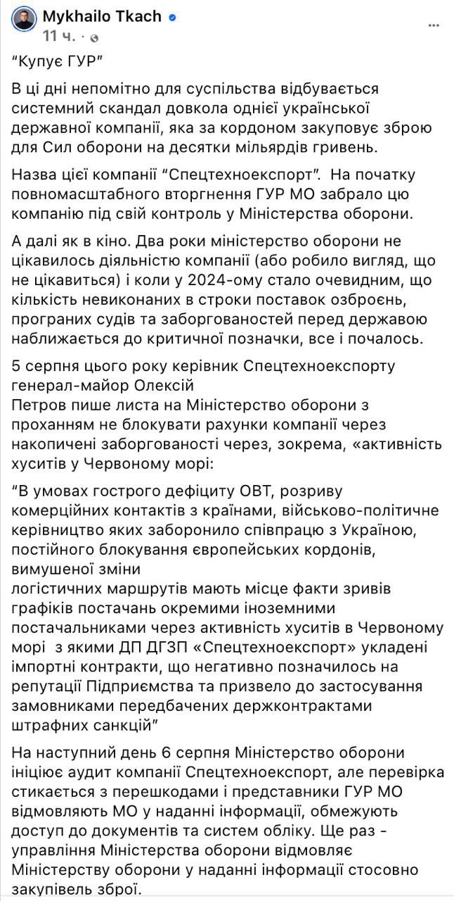 На початку серпня Міноборони України розпочав аудит “Спецтехноекспорта” через накопичені борги. При цьому, стверджує Ткач, представники ГУР чинили перешкоди аудиту, відмовляючись видавати документи та відкривати доступ до закритих систем.