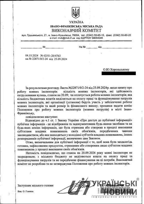 "Станом на 20.09.2024 мовні інспектори не заробили. З міського бюджету не виділяються кошти на оплату праці та функціонування патрулів та не передбачено фінансування на ці потреби", - написав Федорів.