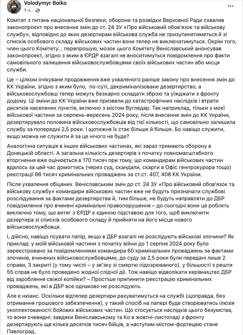 "Тільки з моєї військової частини за серпень-вересень 2024 року, після внесення змін до КК України, дезертувала половина військовослужбовців від тієї кількості, яка самовільно залишила службу за попередні 2,5 роки. І щотижня їх стає більше і більше. Бо навіщо? служити, якщо можна не служити і за це нічого не буде? – пише Бойко.