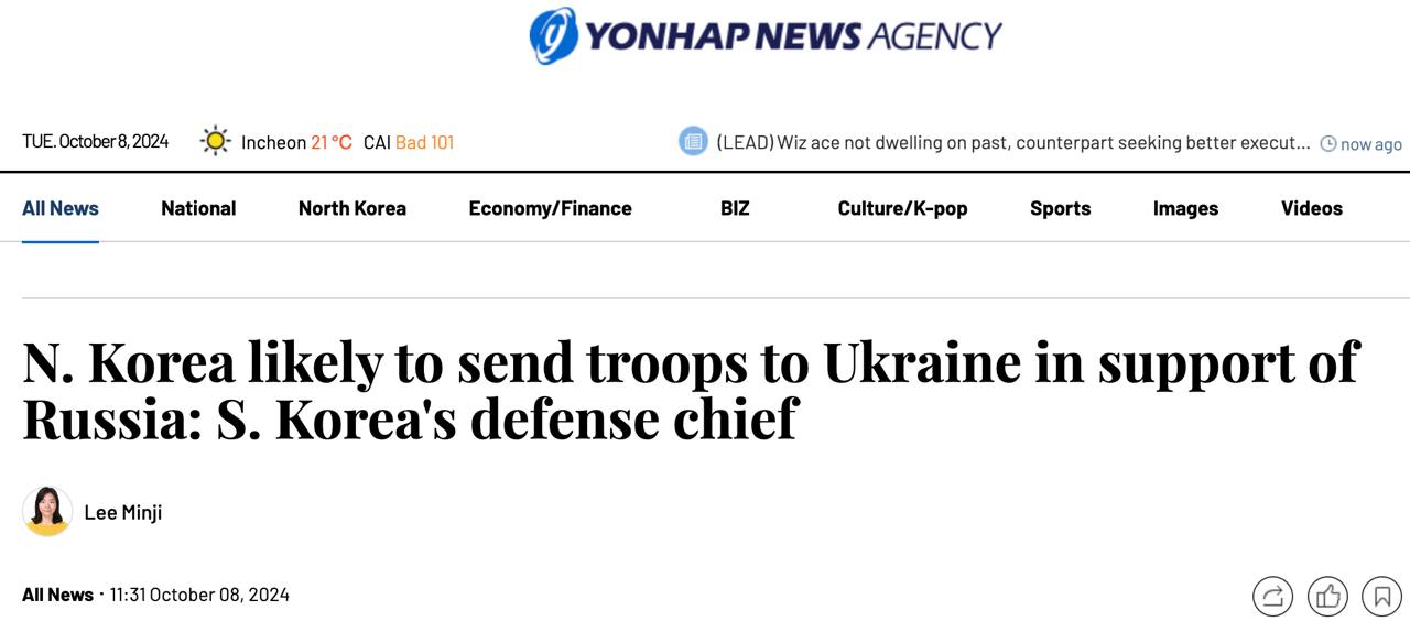 "Оскільки Росія і Північна Корея підписали взаємну угоду, схожу з військовим союзом, можливість такого розгортання дуже ймовірна", - заявив міністр оборони Південної Кореї Кім Ен Хен у місцевому парламенті.