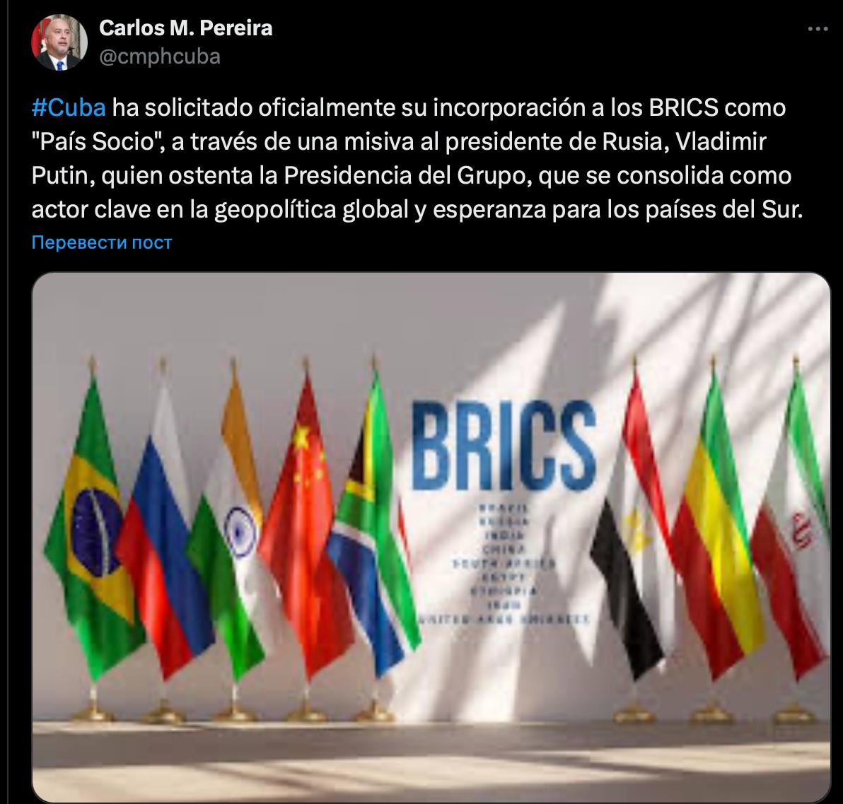 Представник МЗС Куби Карлос Перейра в соцмережі X заявив, що БРІКС - "ключовий гравець у глобальній геополітиці та надія для країн Півдня".