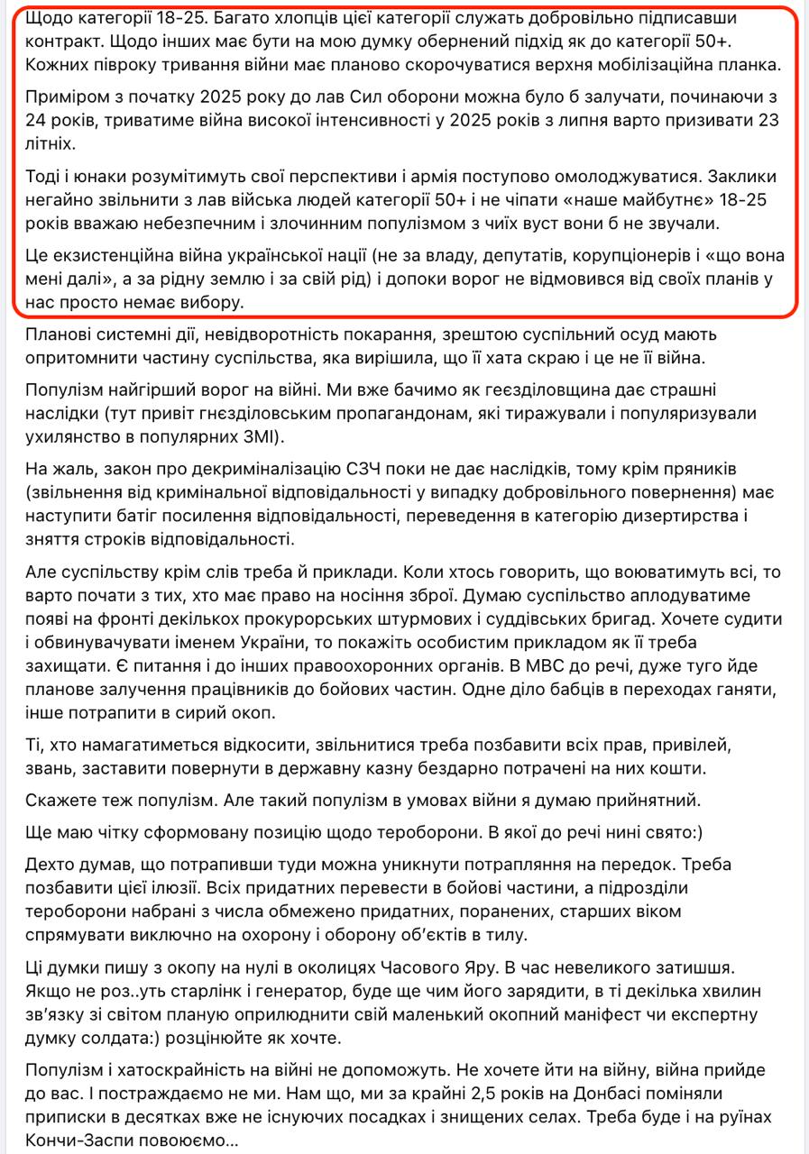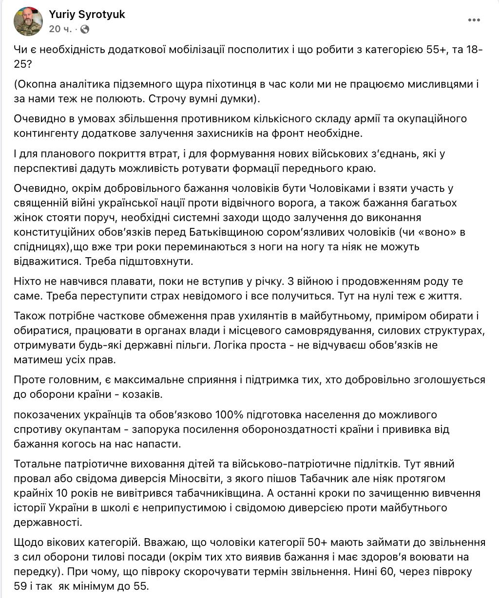 "Кожні півроку тривалості війни має планово скорочуватися верхня мобілізаційна планка. Наприклад, з початку 2025 року до лав Сил оборони можна було б залучати починаючи з 24 років. Триватиме війна високої інтенсивності у 2025 році - з липня варто закликати 23-літніх. Тоді і юнаки розумітимуть свої перспективи, і армія поступово омолоджуватиметься", - написав Сиротюк.