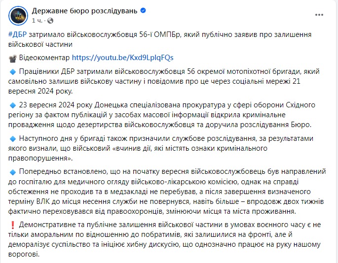 Як сказано у публікації, після заяви військового про самовільне залишення частини Донецька спеціалізована прокуратура у сфері оборони Східного регіону відкрила кримінальну справу за статтею про дезертирство та доручила розслідування Бюро. Наступного дня у бригаді призначили службове розслідування, за результатами якого визнали, що військовий "вчинив дії, що містять ознаки кримінального злочину".