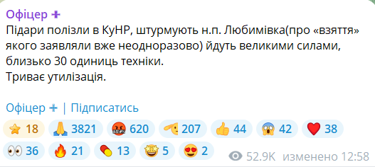 Близько 30 одиниць російської техніки штурмує село Любимівка, пише лейтенант ЗСУ Алекс.