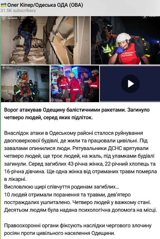 На Одещині після вчорашнього обстрілу загинули четверо людей. Серед загиблих та 16-річна дівчина. Травмовано десятьох осіб.