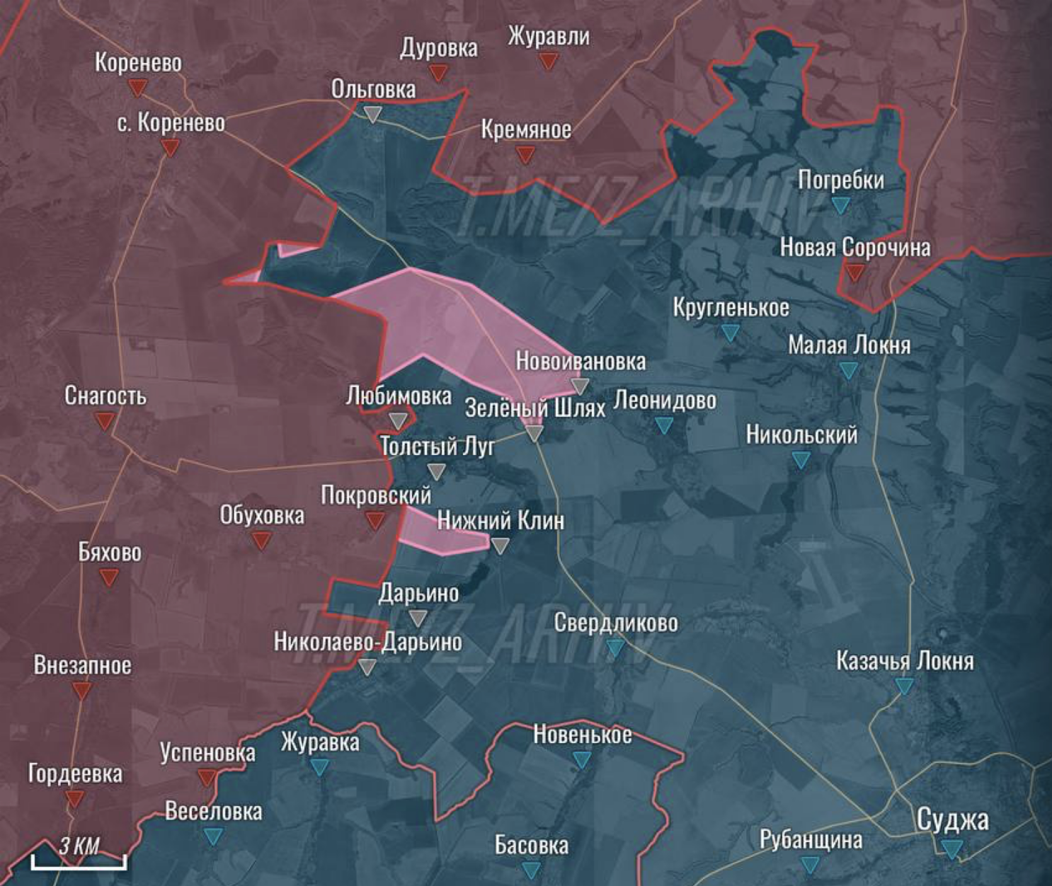 Російські паблики пишуть, що Зелений шлях уже зайнятий і точаться бої за Любимівку та Новоіванівку, а в північній частині підконтрольного України плацдарму в Курській області (в районі Ольгівки) частина українських підрозділів опинилася в оточенні.