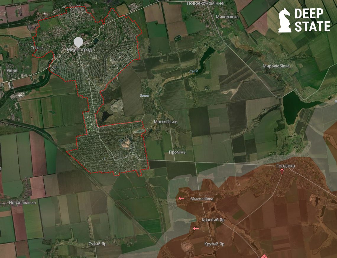 Deep State повідомляє, що росіяни захопили три населені пункти в районі міста Мирнограда - Миколаївку, Червоний Яр та Крутий Яр.