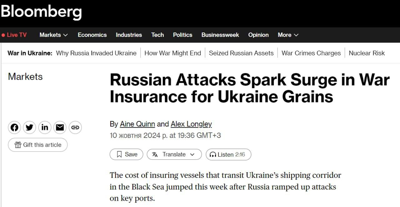 Вартість страховки суден, що проходять через українські морські порти в Чорному морі, різко зросла за тиждень через російські атаки.