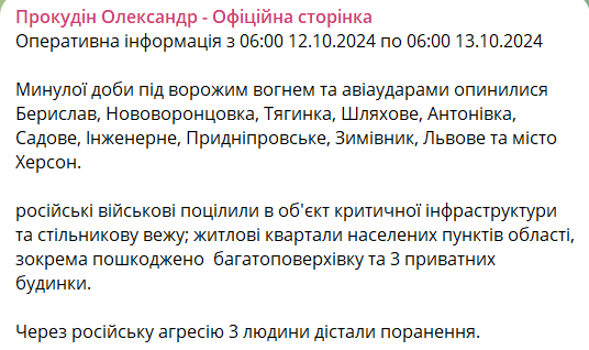 08:00 На Херсонщині минулої доби внаслідок російських обстрілів 3 особи отримали поранення. Про це повідомляє голова ОВ Олександр Прокудін.