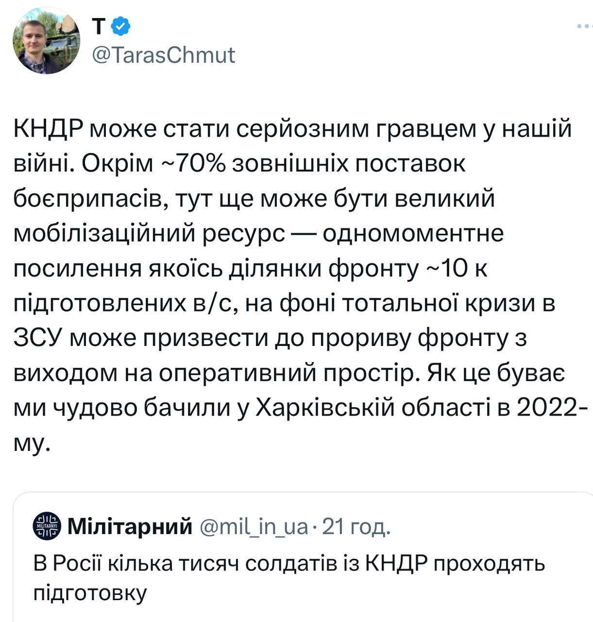 "КНДР може стати серйозним гравцем у нашій війні. Крім 70% зовнішніх поставок боєприпасів тут ще може бути великий мобілізаційний ресурс - одномоментне посилення якоїсь ділянки фронту приблизно 10К підготовлених військових, на тлі тотальної кризи у ЗСУ може призвести до прориву фронту з виходом на оперативний простір. Як це буває, ми чудово бачили в Харківській області в 2022 році", – повідомив Чмут.