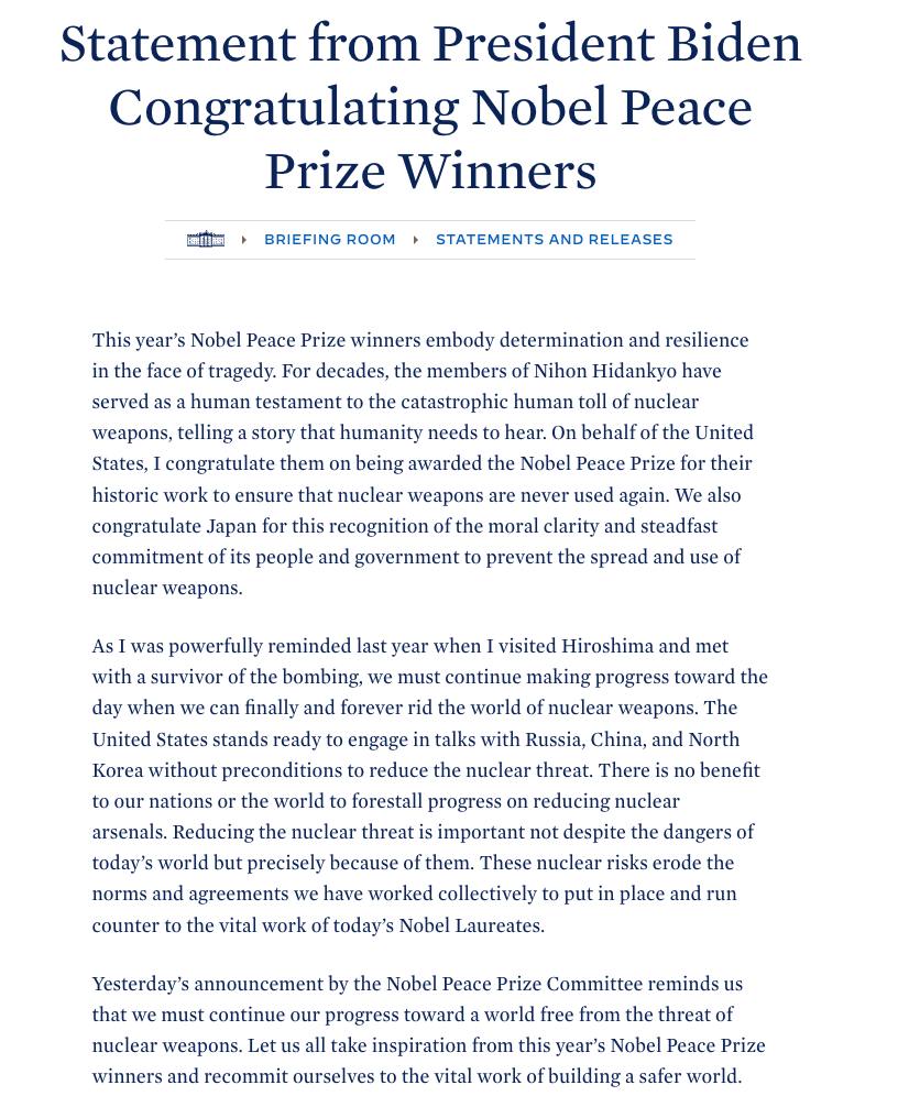 Заява була присвячена лауреатам Нобелівської премії миру, яких привітав американський президент. Премію цього року здобула японська організація за ядерне роззброєння.