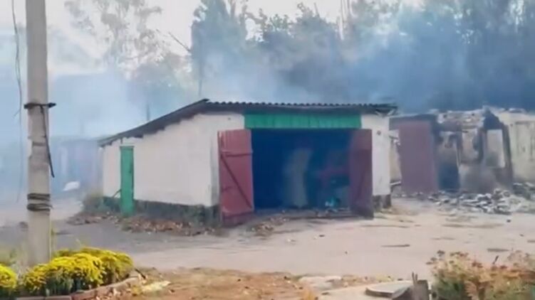 На кадрах видно ряди гаражів, більшість із яких повністю зруйновано обстрілом. Крім цього дві триповерхові багатоквартирні житлові будівлі – біля першого будинку повністю обвалився кут; біля другого фундаменту спостерігається горіння. У повітрі ще висить дим після розриву боєприпасу.