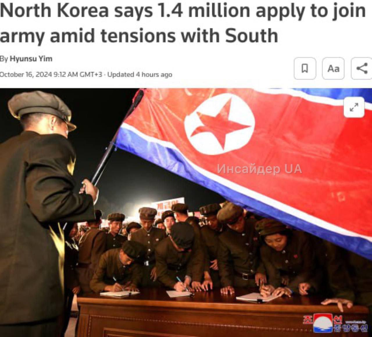 Державні ЗМІ Північної Кореї повідомили, що близько 1,4 мільйона молодих людей подали заявки на вступ до армії чи повернення до армії цього тижня. Це сталося на тлі звинувачень з боку КНДР Сеула у провокаційному вторгненні дронів, яке поставило "напружену ситуацію на межу війни".