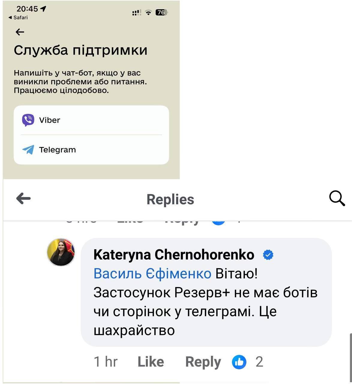 Заступник міністра оборони Катерина Чорногоренко заявила, що Резерв не має ботів або сторінок у Телеграмі.