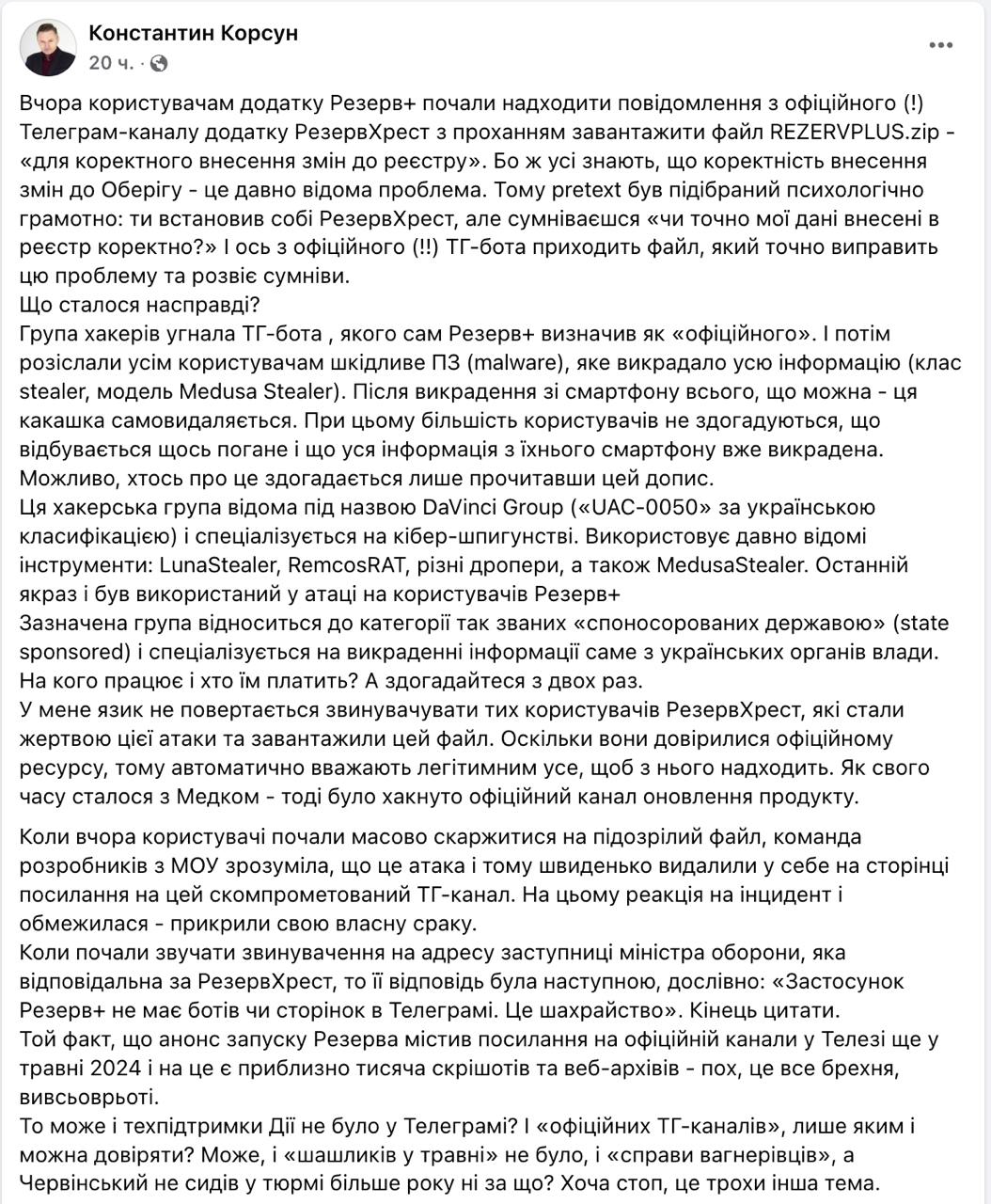 Корсун натякає, що це зробили російські державні хакери, які спеціалізуються на викраденні інформації з українських органів влади.