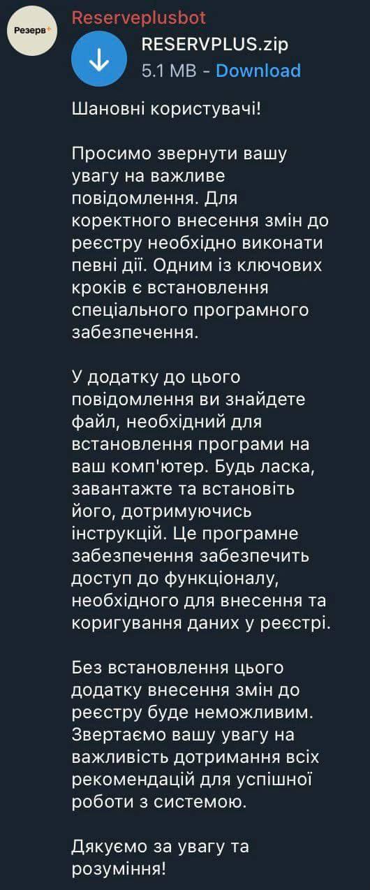 У повідомленні від офіційного робота говорилося, що "для коректного внесення змін до реєстру" Оберіг людям потрібно завантажити спеціальну програму. За фактом це програмне забезпечення краде з телефону всю можливу інформацію і самовидаляється, а людина навіть не знає, що це сталося.