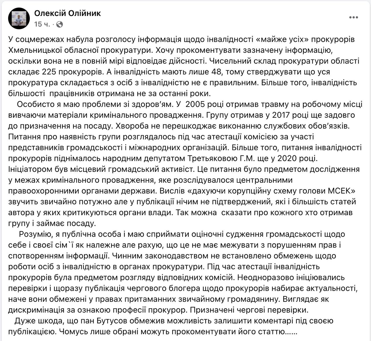 "Більше того, інвалідність більшості працівників отримана не останніми роками", - зазначив Олійник у своєму Фейсбуці.